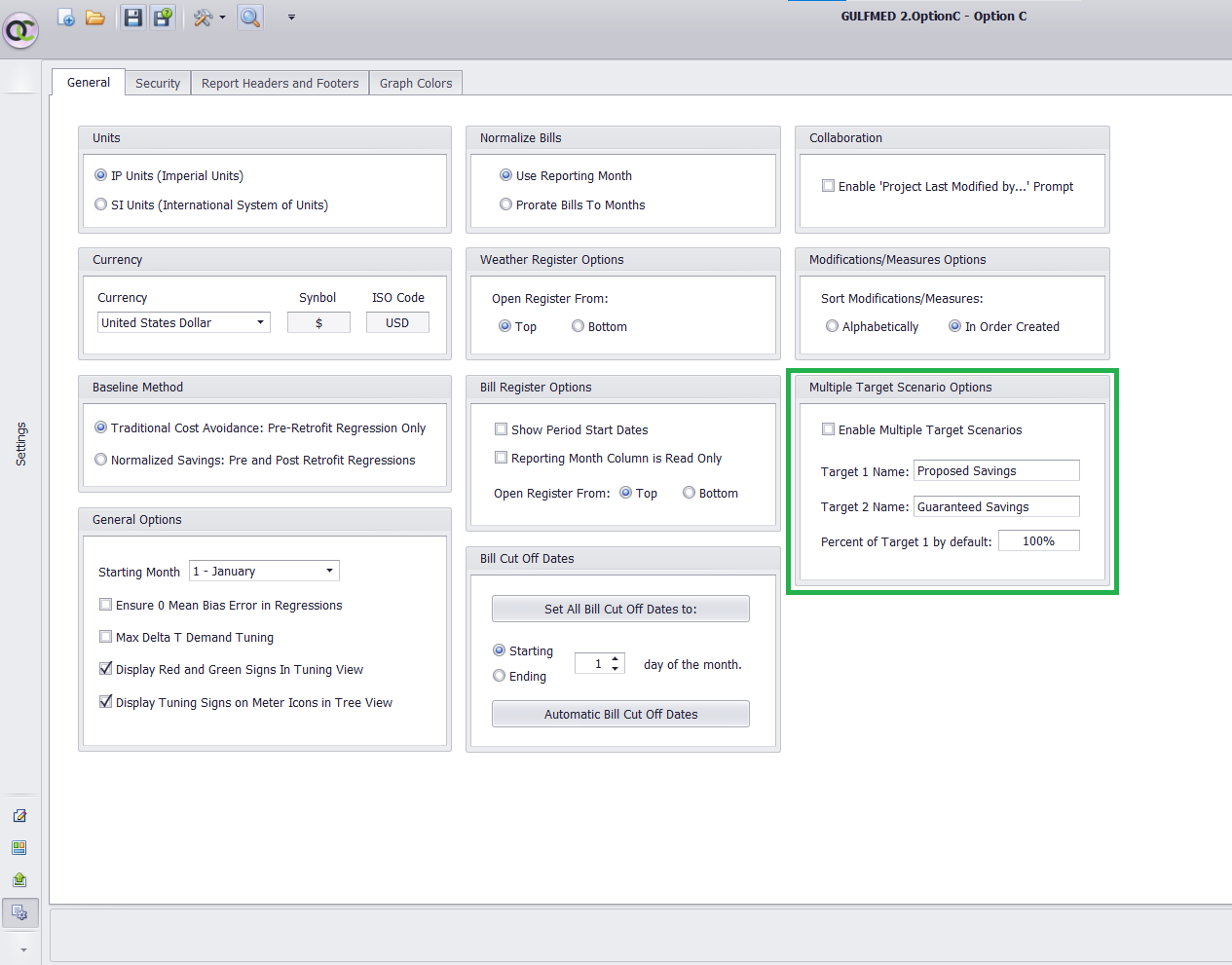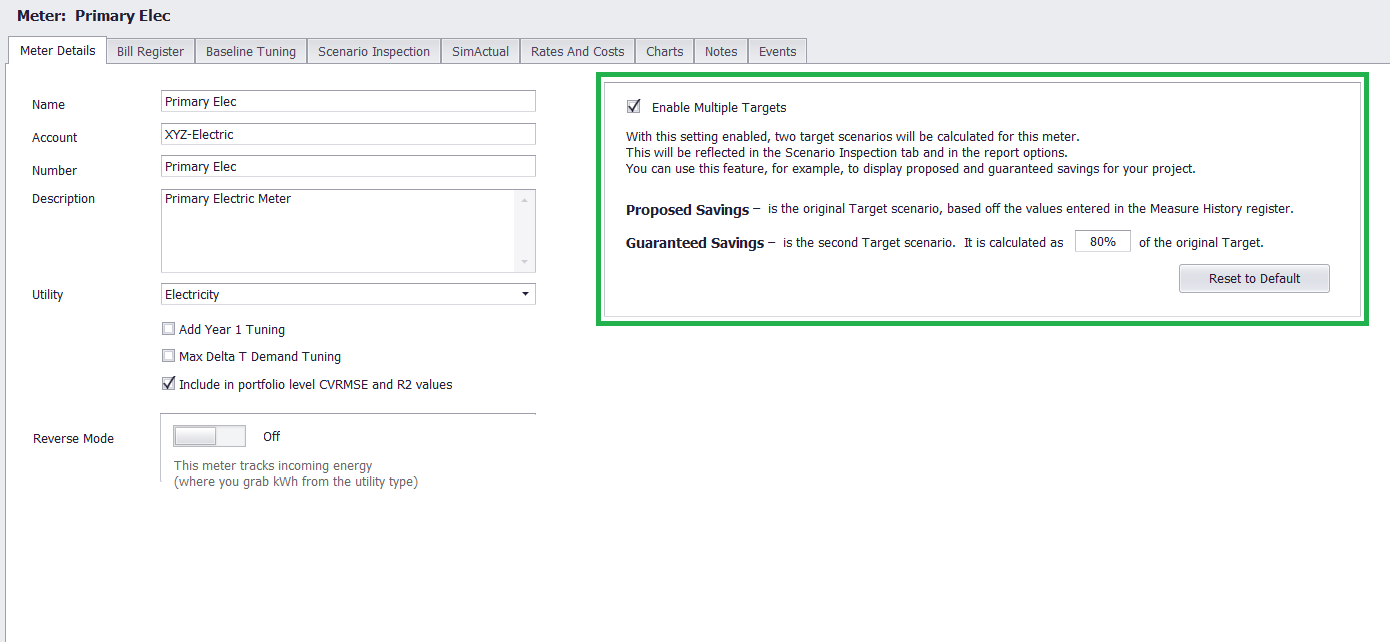 By default, the Target scenarios will be named Proposed and Guaranteed Savings, but both names can be customized. Target 1 will display the original Target data, while Target 2 will be calculated as a percentage of Target 1.