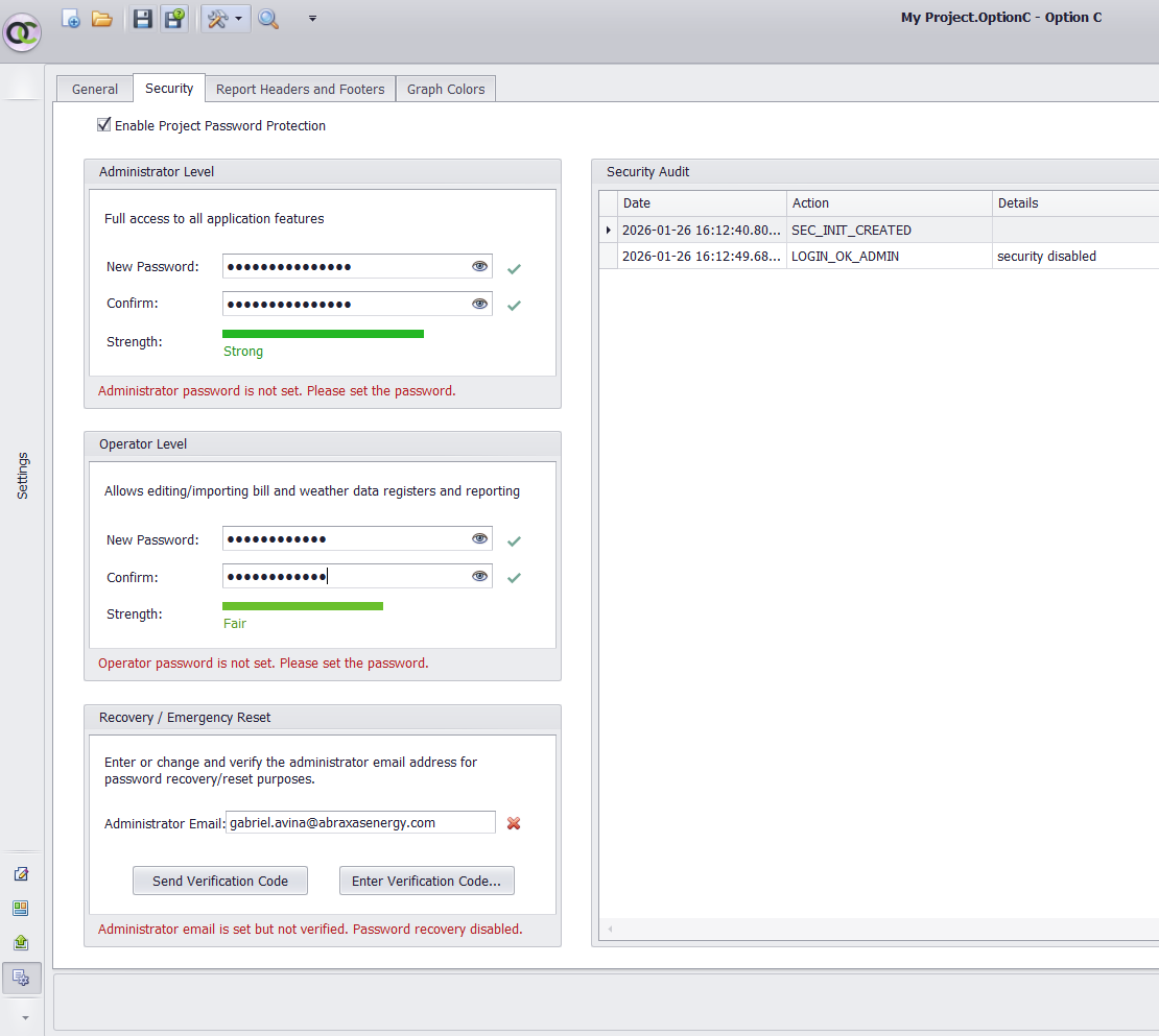 - Operator Level: This password will allow updating of utility/weather data registers, and running reports. (Meter Tunings, Modifications, Measures, Variables, and Rates will be locked.)