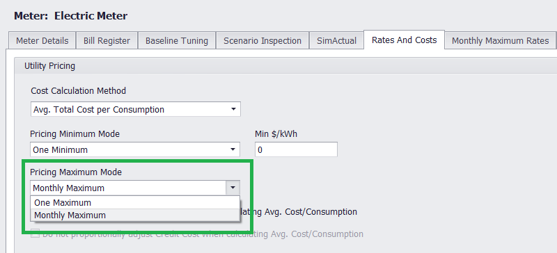 A Monthly Maximum option is now available when using the ‘Avg. Total Cost Per Consumption cost calculation method. (Previously, Monthly Maximums could only be added to modelled rates.)